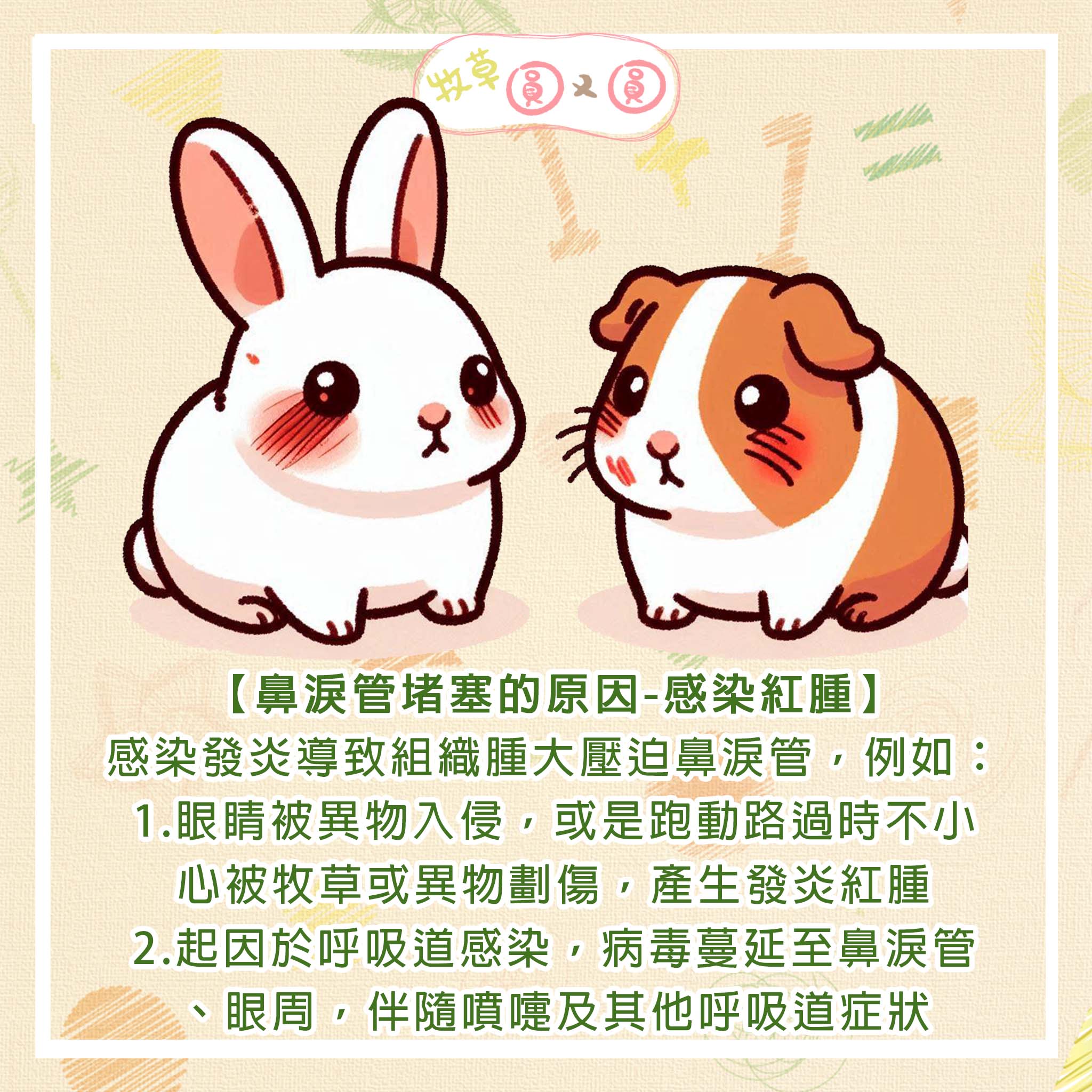 1.眼睛被異物入侵,或是跑動路過時不小心被牧草或異物劃傷,產生發炎紅腫。