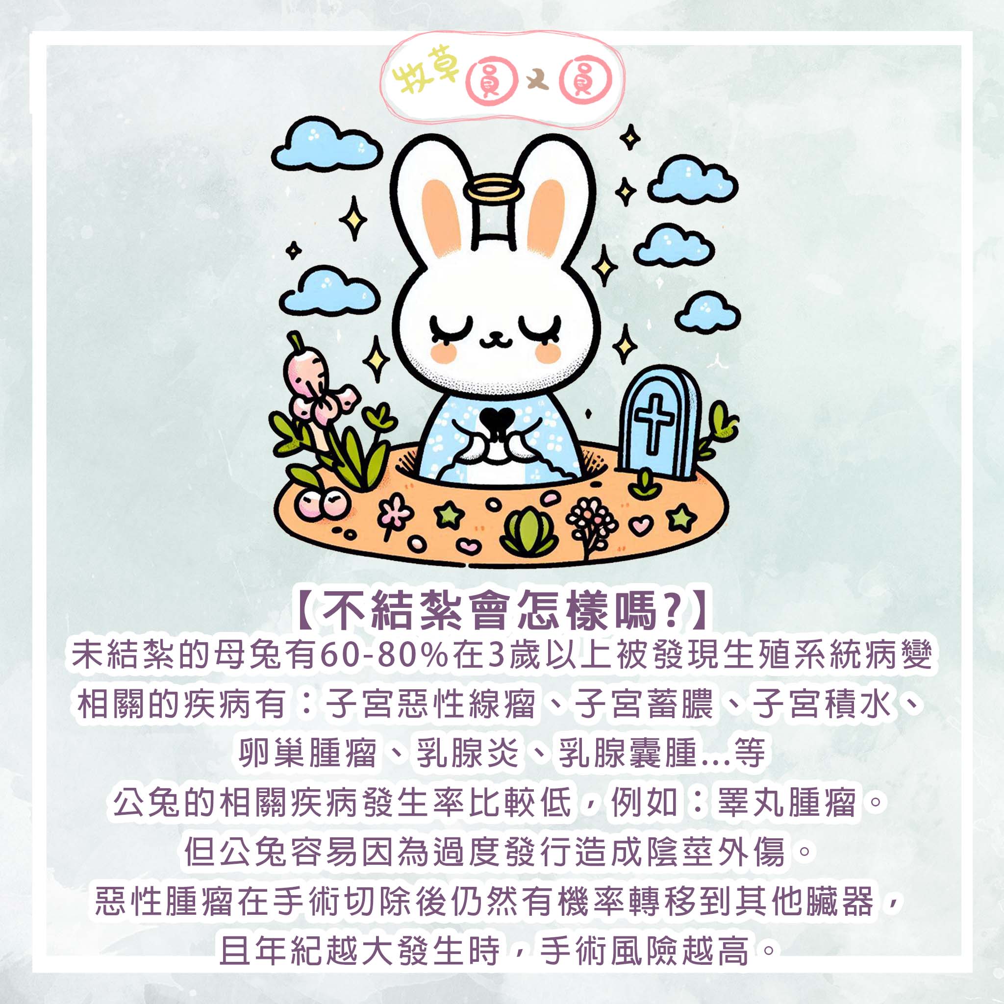 結紮手術風險約在1%-3%左右,兔兔滿8個月後就可以評估是否能安排結紮