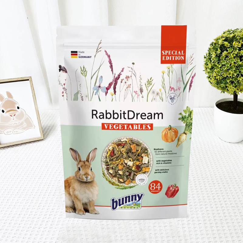 84種草種(提摩西草、羊茅草甸、紅羊茅、草甸狐尾草、藍草.....63種多元草種為基底)、燕麥皮麩、葵花籽提取物、胡蘿蔔粕、麥麩、亞麻籽萃取物、蘋果粕、油菜籽萃取物、歐芹莖(2%)、菊苣根、防風草(2%)、南瓜片(1.2%)、甜椒(1%)、萬壽菊花、茴香籽、甘菊花木瓜乾、啤酒穀物、角豆粉、啤酒酵母、碳酸鈣、菊苣菊粉(蔬菜6.2%)