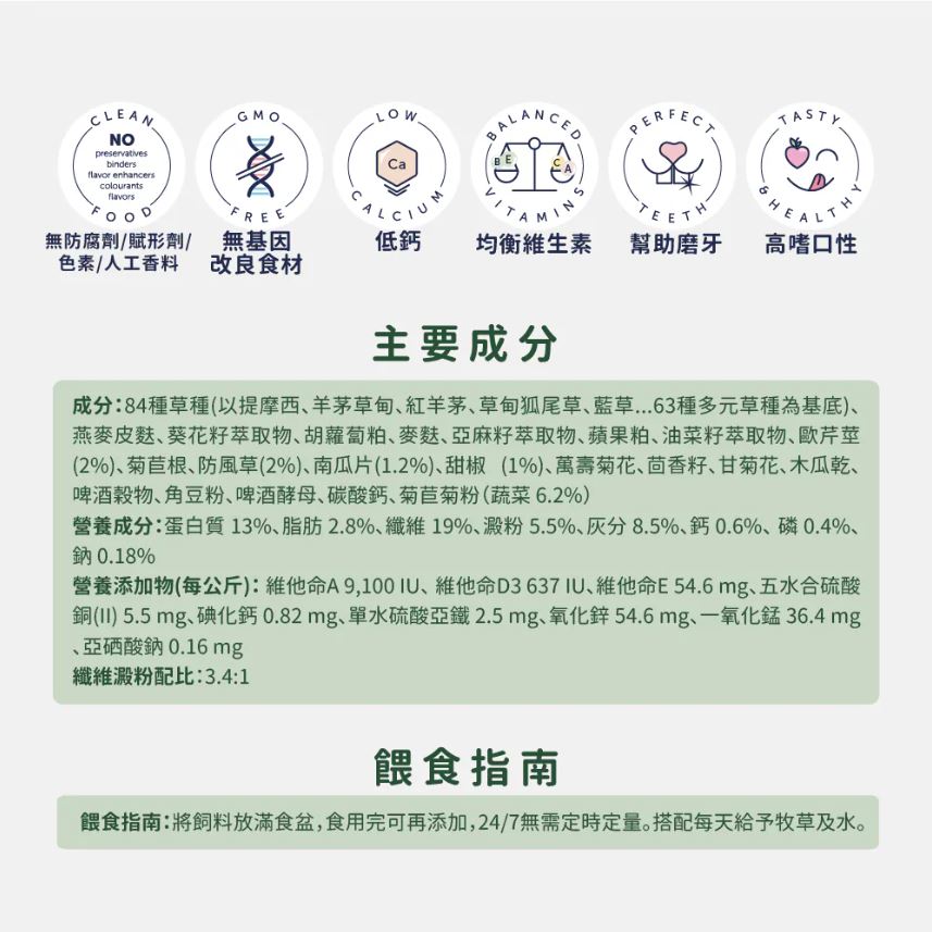 ✅ 怎麼餵:主食搭配足量牧草+每日新鮮飲水;吃完再補,維持自由取食習慣